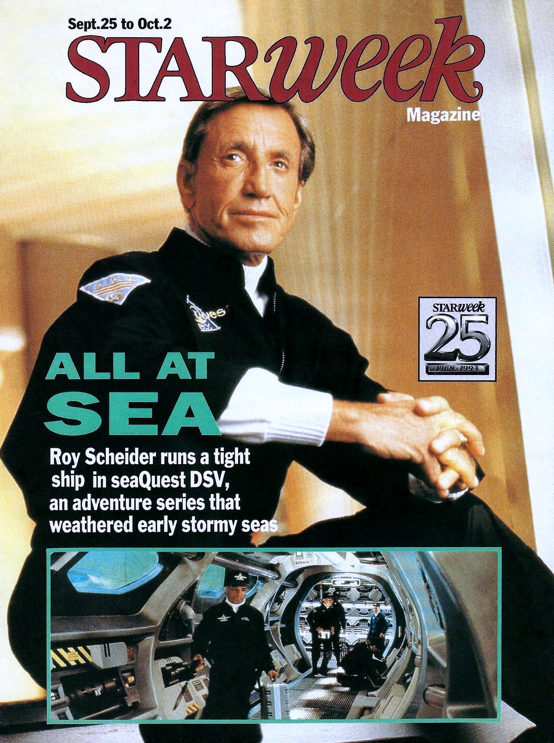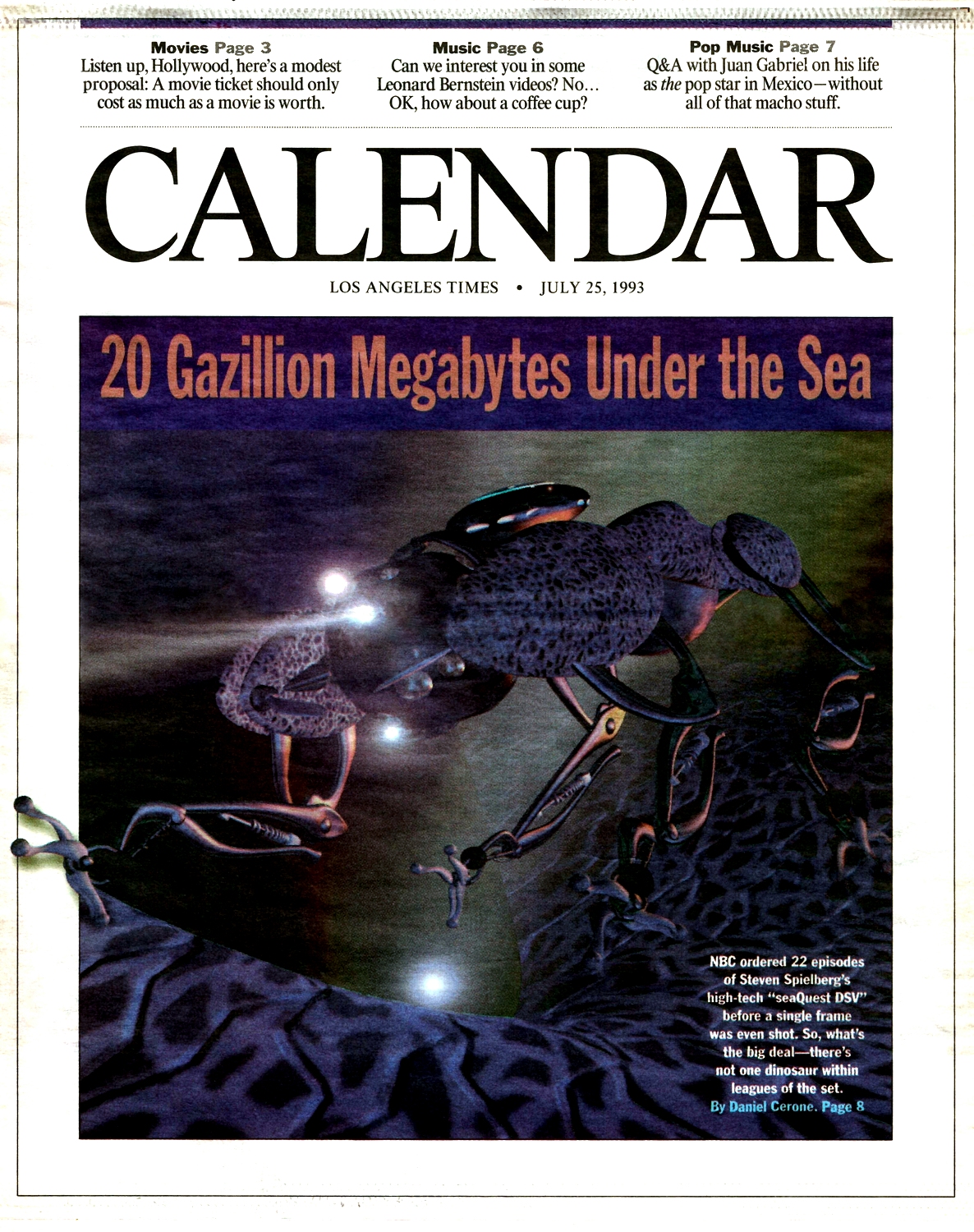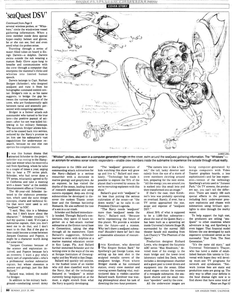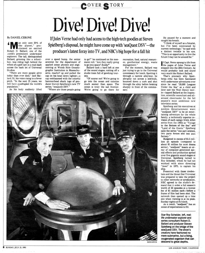 The ethereal image of an alien-looking probe reaching out from the murky depths under the headline of ’20 Gazillion Megabytes Under The Sea’ would be the first tantalising glimpse for US audiences of the bold new joint venture between Steven Spielberg’s Amblin Entertainment and the NBC Network, seaQuest DSV.