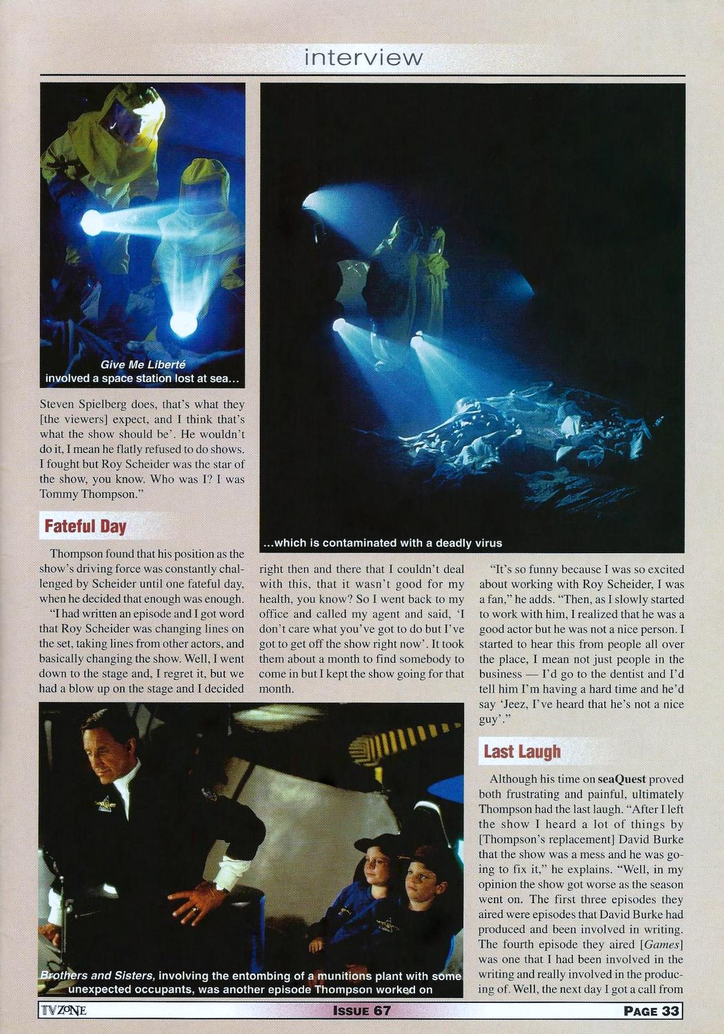 Ultimately Thompson may have walked the plank but soon fell into another, more lucrative collaboration with Paramount while seaQuest’s troubles continued throughout the first season and beyond. Ironically, the theme of the show was changed to that of ‘traditional science fiction’ for the second season and while Scheider continued to protest, one can’t help but think Thompson’s input may have been a welcome and positive one with such experience in the genre had he stuck it out…