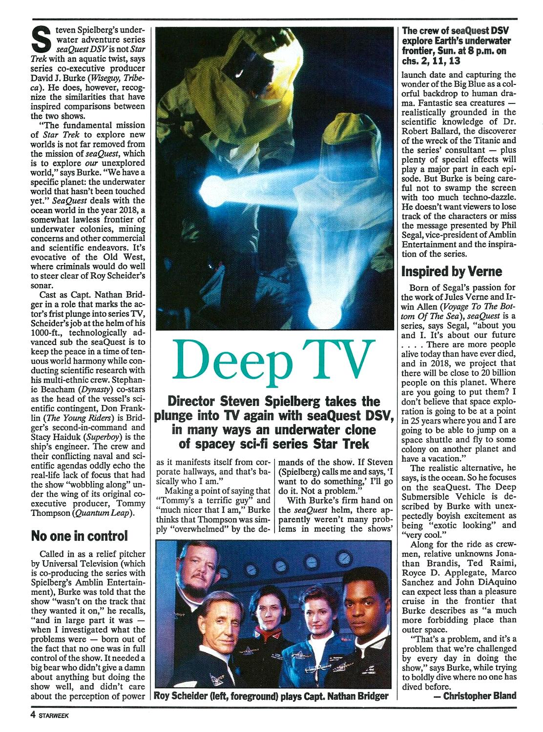 We continue the fascinating barnacles-and-all story of the creation and development of seaQuest with these two contrasting vintage articles. The first, Christopher Bland’s piece for Starweek Magazine from 1993, is a vanilla promotional write-up that, like most others, attributed the show’s shaky start to its young co-executive producer.