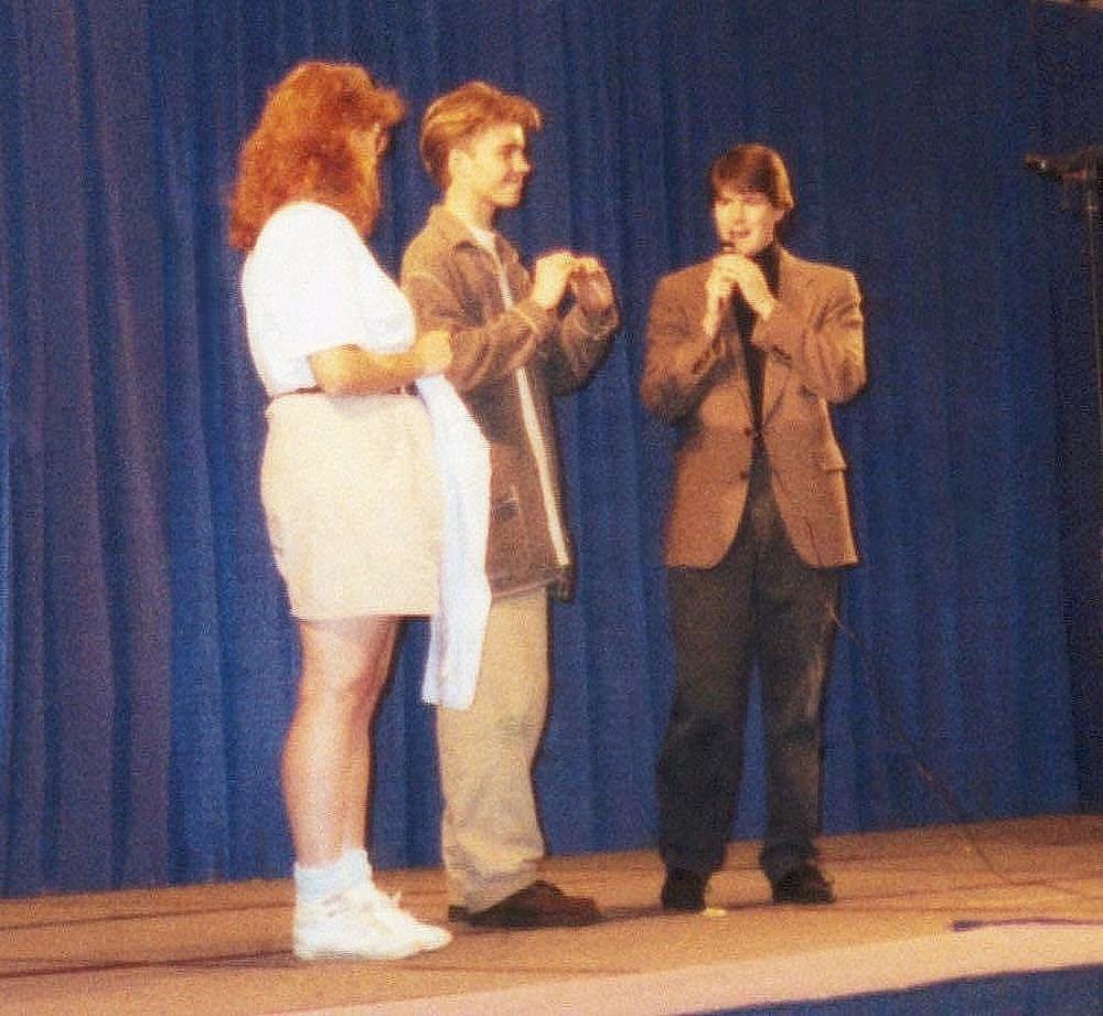 After his talk, Jonathan and Greg stayed in the main ballroom, as promised, to watch our seaQuest parody. I played Nathan Bridger. Memories of the show? Not many. Strutting out in my Sunny’s Surplus jumpsuit to John Debney’s seaQuest DSV theme… Arguing with my young friend Ian Bonds (playing Lucas) over a live video feed with a pretty impressive (for 1994) imitation of a UEO video call. At one point, I adlibbed the line, “Kids. Can’t live with ’em. Can’t send ’em to Singapore!” I got the requisite boos. Michael Fay was very much in the news at the time.