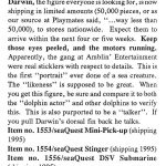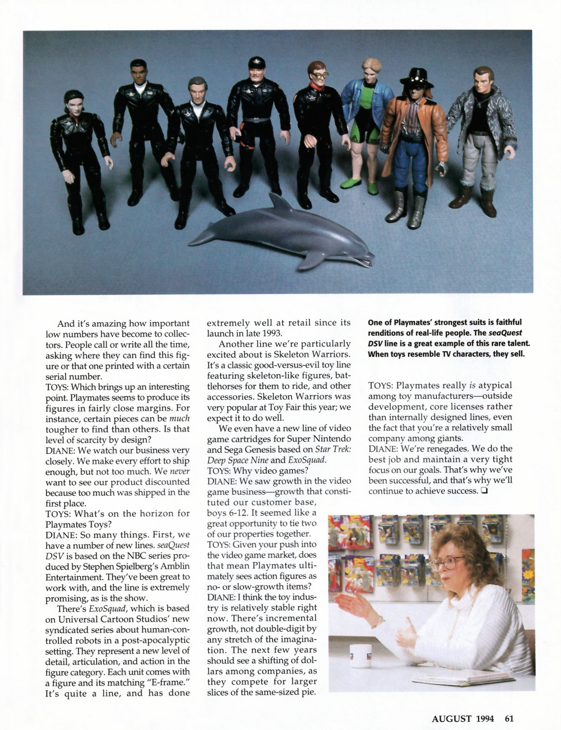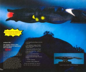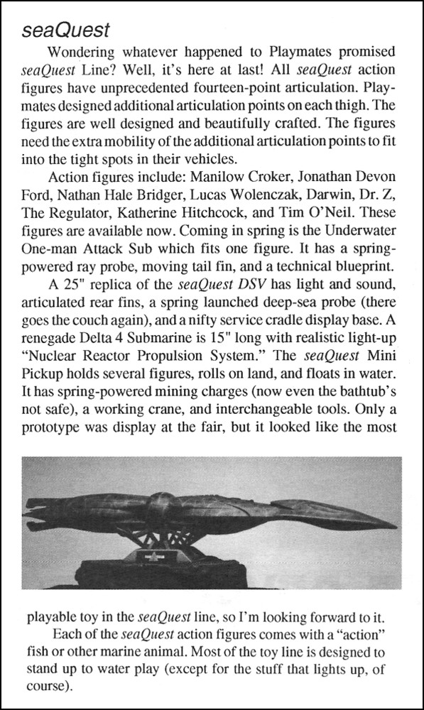 seaQuest was the highlight of the 1994 Playmates catalogue, showcased over eight glossy pages previewing both the individually-numbered action figure line and an impressive range of vehicles. A multi-million dollar advertising campaign featuring everything from TV ads starring Darwin the Dolphin to an attraction in Universal theme parks were also scheduled to surface that summer –
