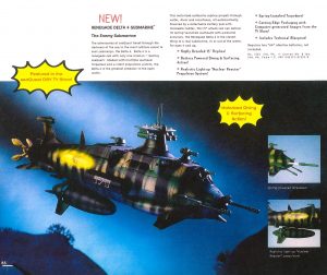 The seaQuest license was first announced in the 1993 Playmates catalogue. with no product yet to show, the double-page spread featured James Lima’s concept art of the futuristic Submarine with a promise of making a ‘huge splash’ in Fall ’93. The first of the prototypes would appear at the New York Toy Fair in 1994 –
