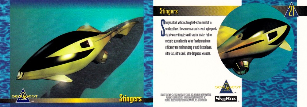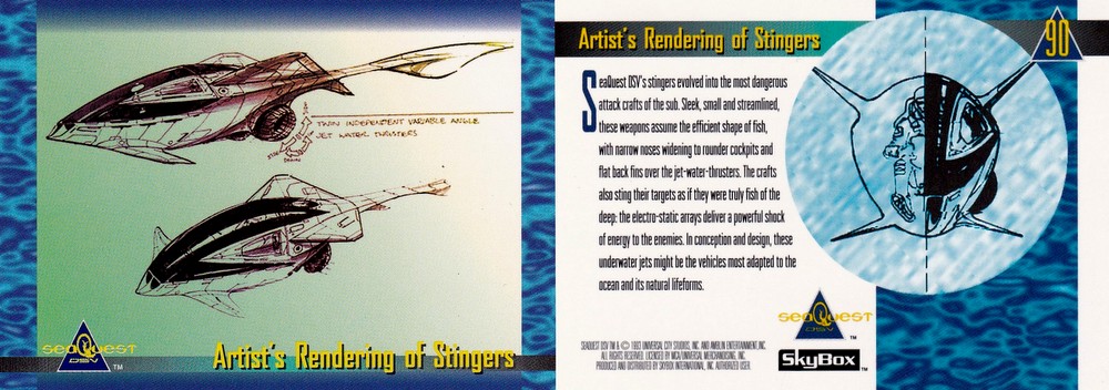 Originally conceived by seaQuest Conceptual Designer James Lima as the ‘Cavalry Pony for the Marine Frontier’, the Stinger one-man Submarine was intended to form a squadron of fighters to combat the undersea Pirates of the future. Deployed from the EVA sphere of the seaQuest, the Stingers were armed with mini Plasma Torpedoes and a high-energy Electro-static ‘Sting’.
